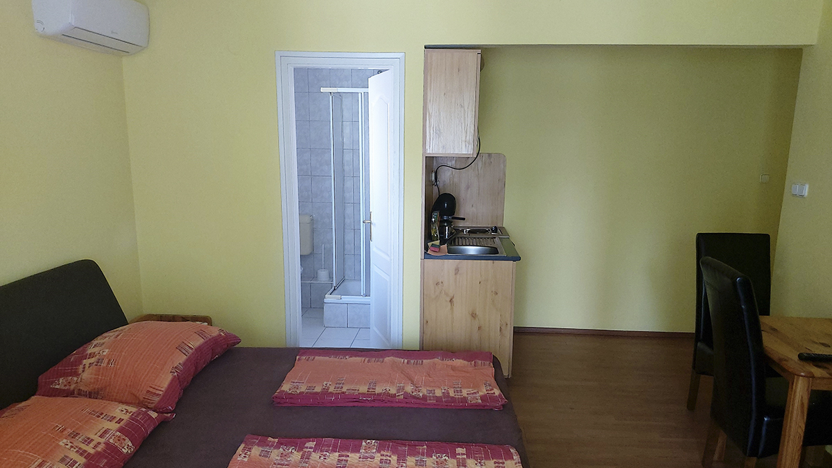 Az emeleti részén egy klimatizált harminc négyzetméteres kétágyas, komfortosan berendezett apartman található, teljesen felszerelt konyhával, étkezővel, LED Tv-vel, fürdőszobával rendelkeznek. A fürdőszobában tusoló és WC található. A konyha mikróval, hűtőgéppel, villanytűzhellyel, kávéfőzővel, evőeszközökkel, tányérokkal, poharakkal, főző és sütő edényekkel fel van szerelve. Erkély tartozik az apartmanhoz .